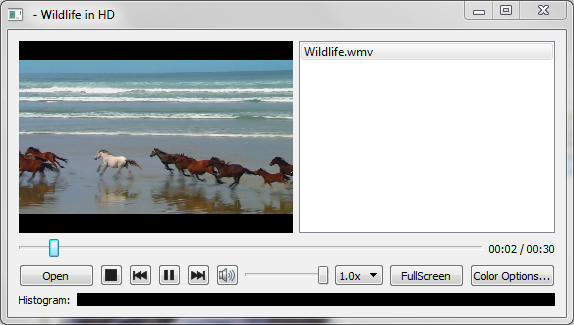 The example also allows us to change video properties by means of the QVideoWidget object. We can go to Full Screen mode with a single button click, and back again.