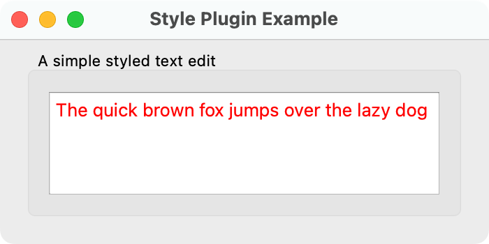 Plugins that provide new styles inherit the QStylePlugin base class. Style plugins are loaded by Qt and made available through QStyleFactory; we will look at this later. We have implemented SimpleStylePlugin, which provides SimpleStyle. The new style contributes to widget styling by changing the text color of the text edit widget to red - not a major contribution, but it still makes a new style.