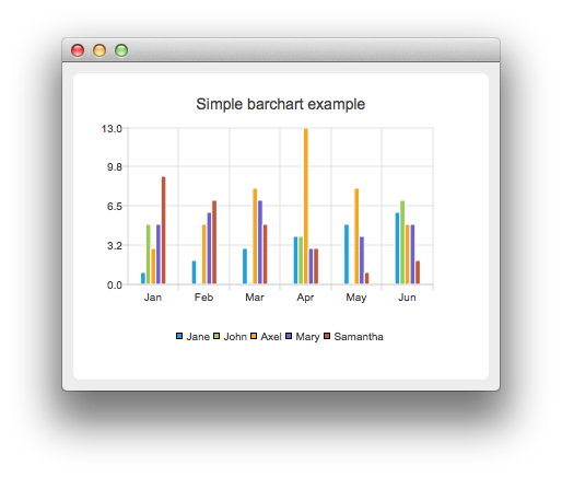 See the Charts with Widgets Gallery to learn how to use the QBarSeries class to create a simple bar chart.