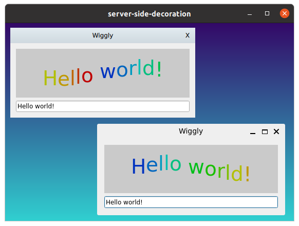 In addition, the example initializes the XdgDecorationManagerV1 extension. This allows it to communicate to the client that it prefers server-side decorations.