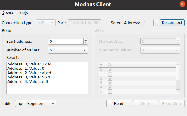 To write the data to the Modbus server, the client needs to specify the server address, and the parameters of objects that it wants to write. As with reading the data, the QModbusDataUnit class is used to represent the information about the data to be written. This time the data also includes the desired values. The sendWriteRequest() method is used to write the desired data: