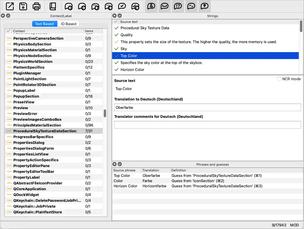 2. Select a context in the Context view to display translatable strings in the Strings view.