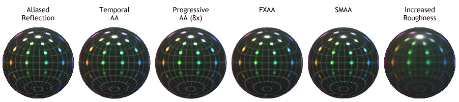 As demonstrated in the picture for Reflection Aliasing above, sometimes the simplest fix for problems is to change the artwork. If you are getting distracting specular glints on the corner of your model, ask yourself: Can I make the material softer? Can I modify the geometry to smooth or change the reflection angle? Can I edit the environment map to reduce sharp transitions?