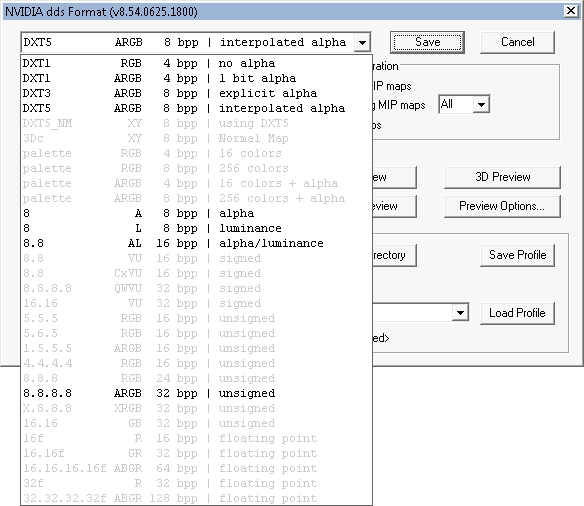 - 8.8.8.8 ARGB - Lossless RGB and alpha. Try to use DXT5 before you resort to this 4-times-larger encoding.