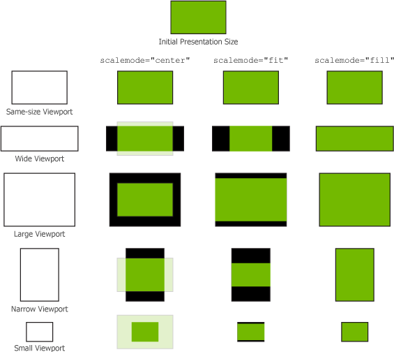Center- the presentation is rendered at the size specified in Studio. Additional content is cropped, additional space is letterboxed. This setting is the default setting.Fit- the aspect ratio of the presentation is preserved, the presentation will scale to fit the viewport, letterboxing as needed.Fill- the presentation is always rendered to fill the viewport both horizontally and vertically, adjusting ascpect ratio if needed.