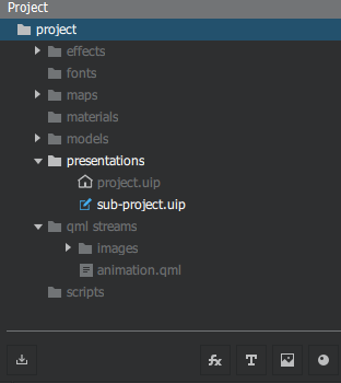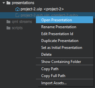 Sub-presentations will be imported to the folder that is selected in the project palette. If no folder is selected, sub-presentations will be imported to the presentations or qml folder depending on the type of the sub-presentation. All assets (such as images, 3D models and effects) and folders of the imported sub-presentation will be imported.