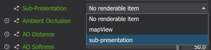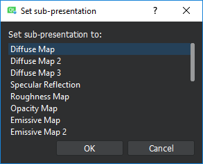 • In the scene graph, right-click the material of an object and select Set sub-presentation. Then select desired sub-presentation and desired property.