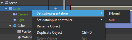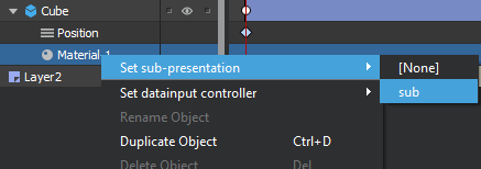 • Right-click a layer in the scene graph and select Set sub-presentation from the context menu. Then select desired sub-presentation.