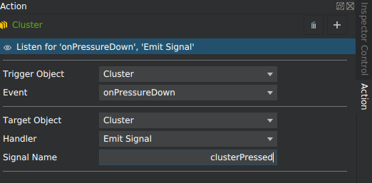 In this example, pressing or tapping on the Cluster object will result in emitting customSignalEmitted("Cluster", "clusterPressed").