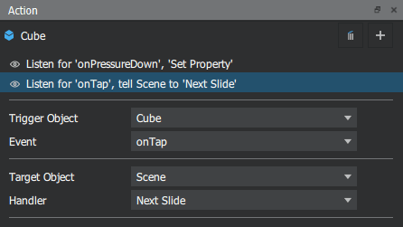 Actions provide a way to create interactivity in a presentation without scripting. Actions listen for an event to occur on an element (or, due to event bubbling, on any descendant of the element), and when it occurs they cause an effect in the presentation. This effect may be a direct modification of the presentation (for example tell a component to switch slides or change the color of an element).