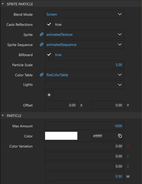 - Ensure that Sprite is set to animatedTexture. This sets which image to emit from the particle emitter, which in this case is the spritesheet added earlier.