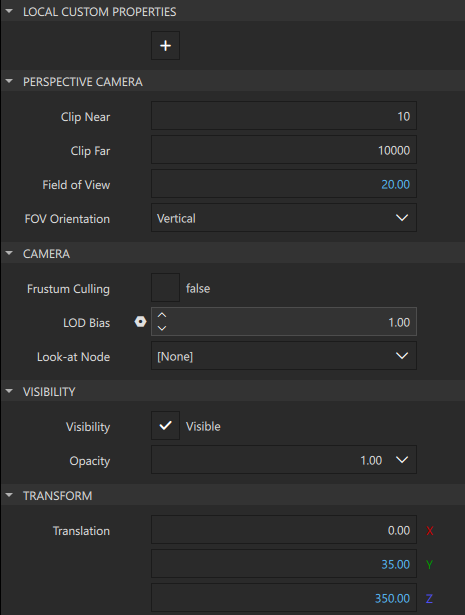 - In the Navigator view, select sceneCamera and in the Properties view, set: