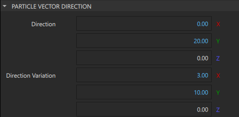 - Direction > X to 0 and Direction > Y to 20. This makes the particles go straight up (along the Y axis) at the velocity of 20.