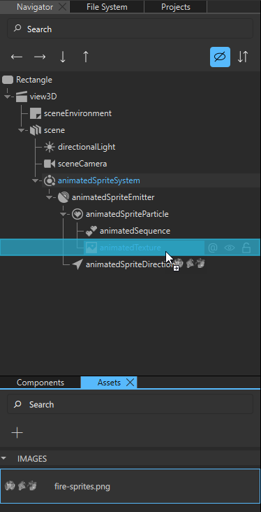 - From the Components view, drag a Texture [1] to animatedSpriteParticle in Navigator.
