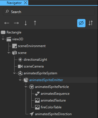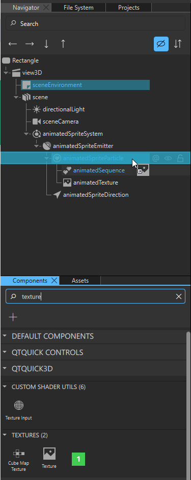 - From Components > Qt Quick 3D Particle System Templates drag an Animated Sprite component [1] to scene in Navigator.