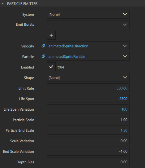 - The animatedSpriteDirection component defines the direction and the velocity of the particles emitted from the particle emitter. In this tutorial, you want the particles to go straight up with a small variation.