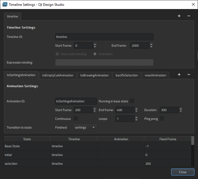to open the Timeline Settings dialog. We select the Add button to create animations for each part of the timeline. Therefore, the start and end frame of each animation are important, whereas their duration is not.