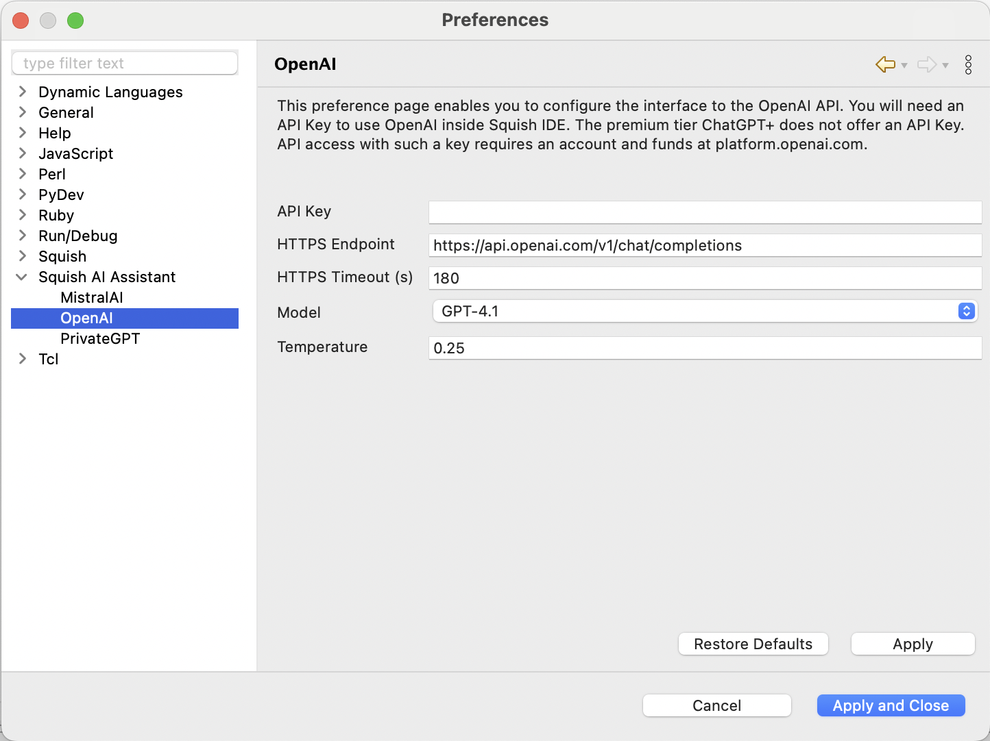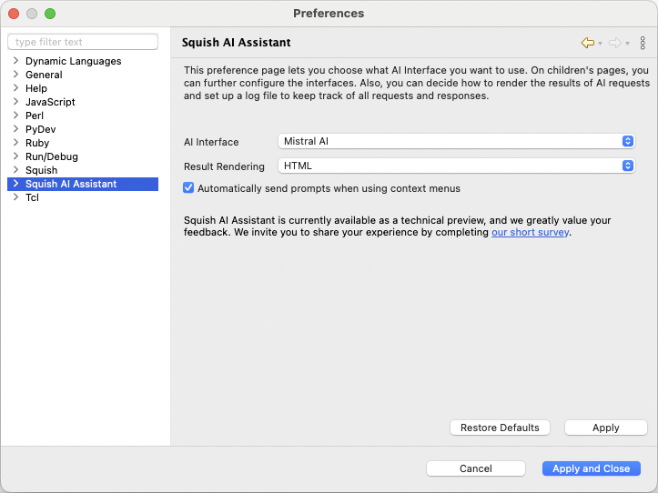 In order to use the Squish AI Assistant it is necessary to configure which Large Language Model (LLM) it should connect to. This is done through the Preferences dialog. Select Edit > Preferences to open the dialog.