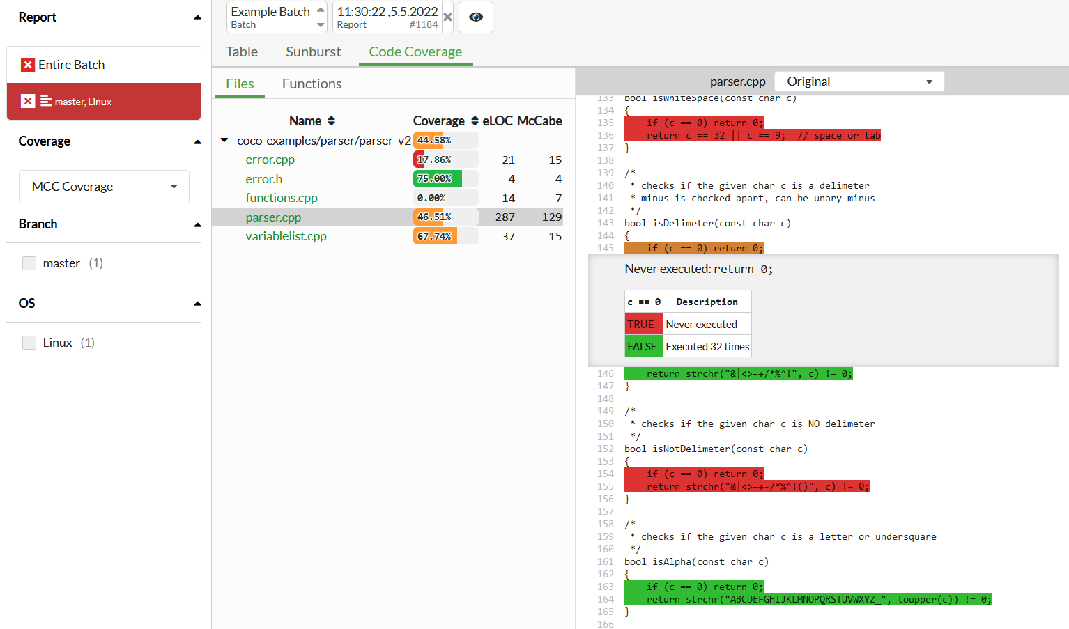 The Code Coverage view displays source file hierarchy, together with the coverage, eLOC, and McCabe complexity of each file. To switch to a class and function hierarchy, select the Files or Functions tab. Select a file or function to open its highlighted source code on the right (or below on narrow screens). Click any of the highlighted lines in the source code to toggle an inline tooltip containing further explanations, user comments, or truth tables for decisions or conditions.
