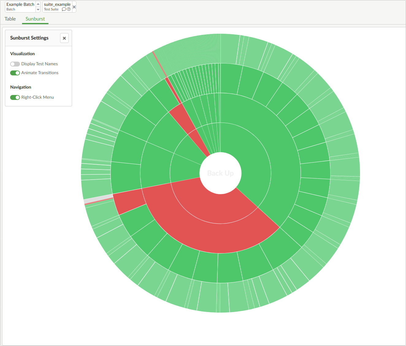 - Display Test Names shows and hides test item names on the diagram slices. Since the space within the sunburst slices is very limited, the text has to be truncated by default. Since the test names are also visible in the tooltips, you can hide the names to achieve a cleaner look.