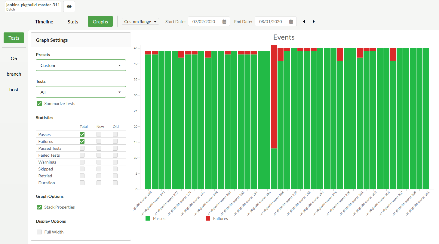 The Graphs view contains graphs for many test properties. In Presets, select a predefined graph, such as Total Passes and Failures or Test Duration By Tests. To configure a custom graph, select Custom, and then select test properties in Tests Statistics. The available test properties include Passes, Failures, Passed Tests, Failed Tests, Warnings, Skips, Retries and Duration.
