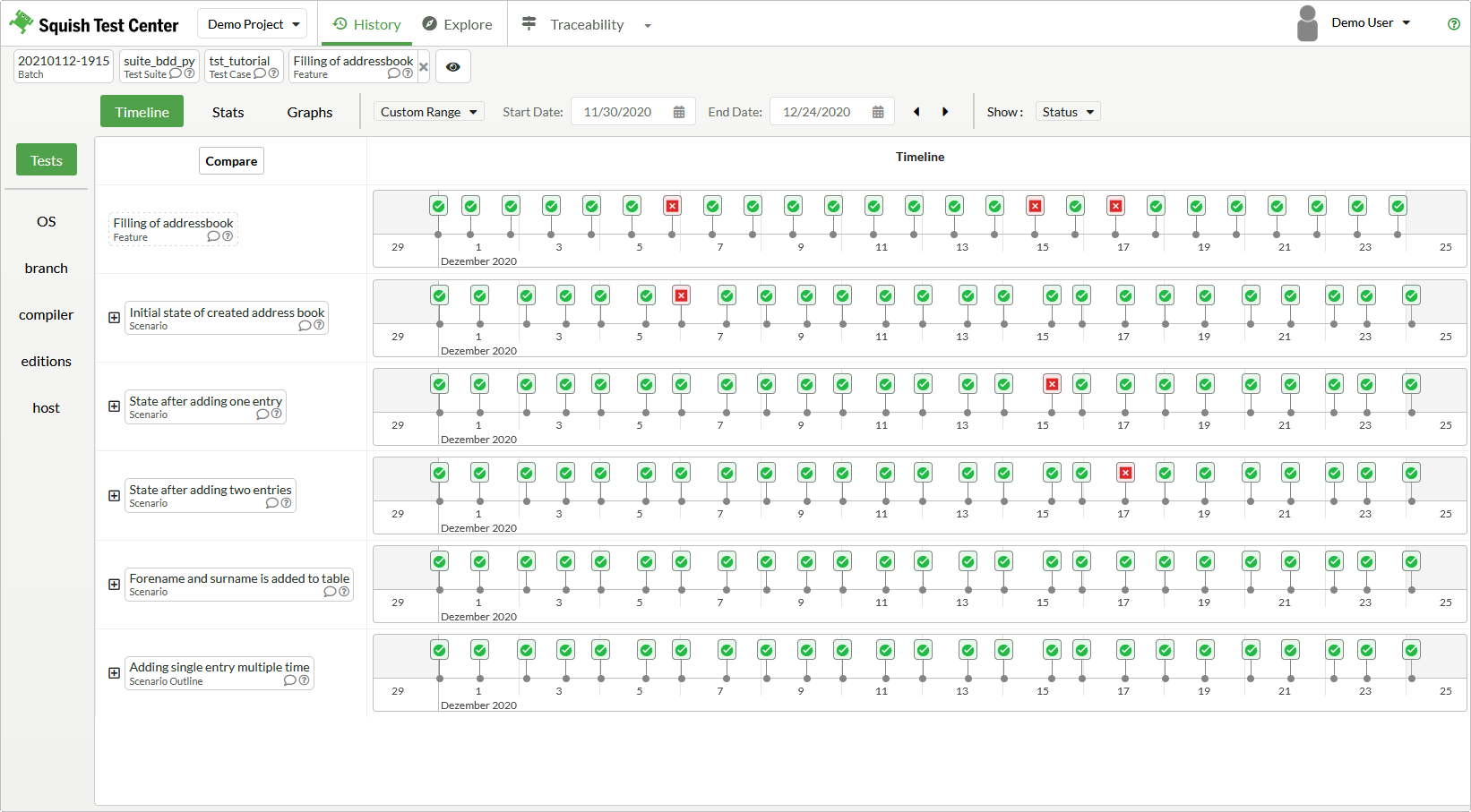 The Timeline shows a status icon representing each batch, for the selected time frame. The status indicates whether the batch was passed (