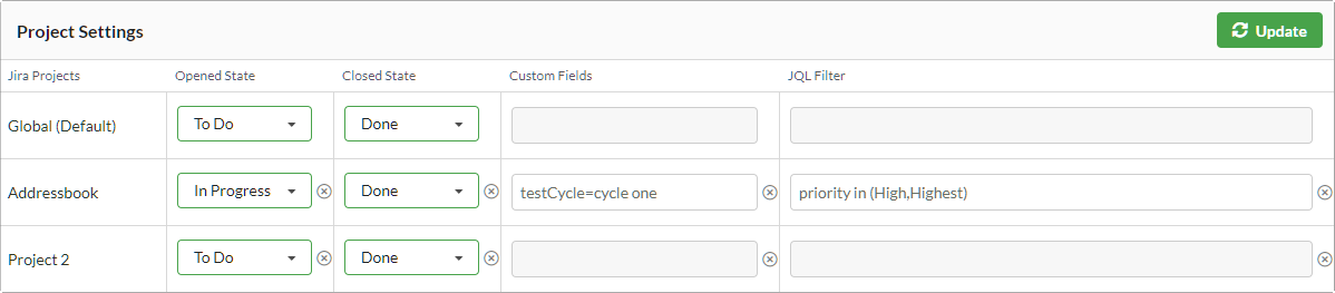 In Project Settings, set default values used by all JIRA projects in Global (Default). Specify settings for individual JIRA projects to override the default settings at project level.