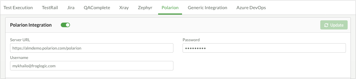 The Polarion integration works both with the cloud and server version. Administrators can turn on Polarion Integration in Global Settings.