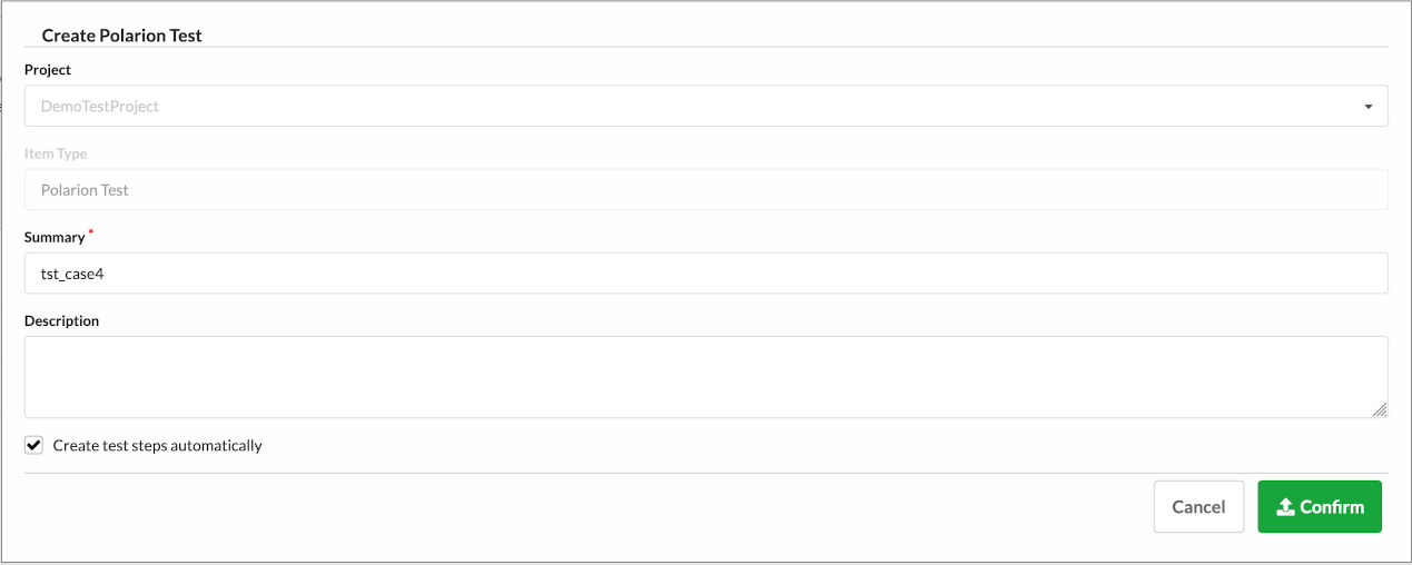 Select Create test steps automatically to not only create the currently selected Test Center test in Polarion but also create its children as steps in Polarion. For example, when you create a Polarion test from a scenario, all steps of the scenario are also created.