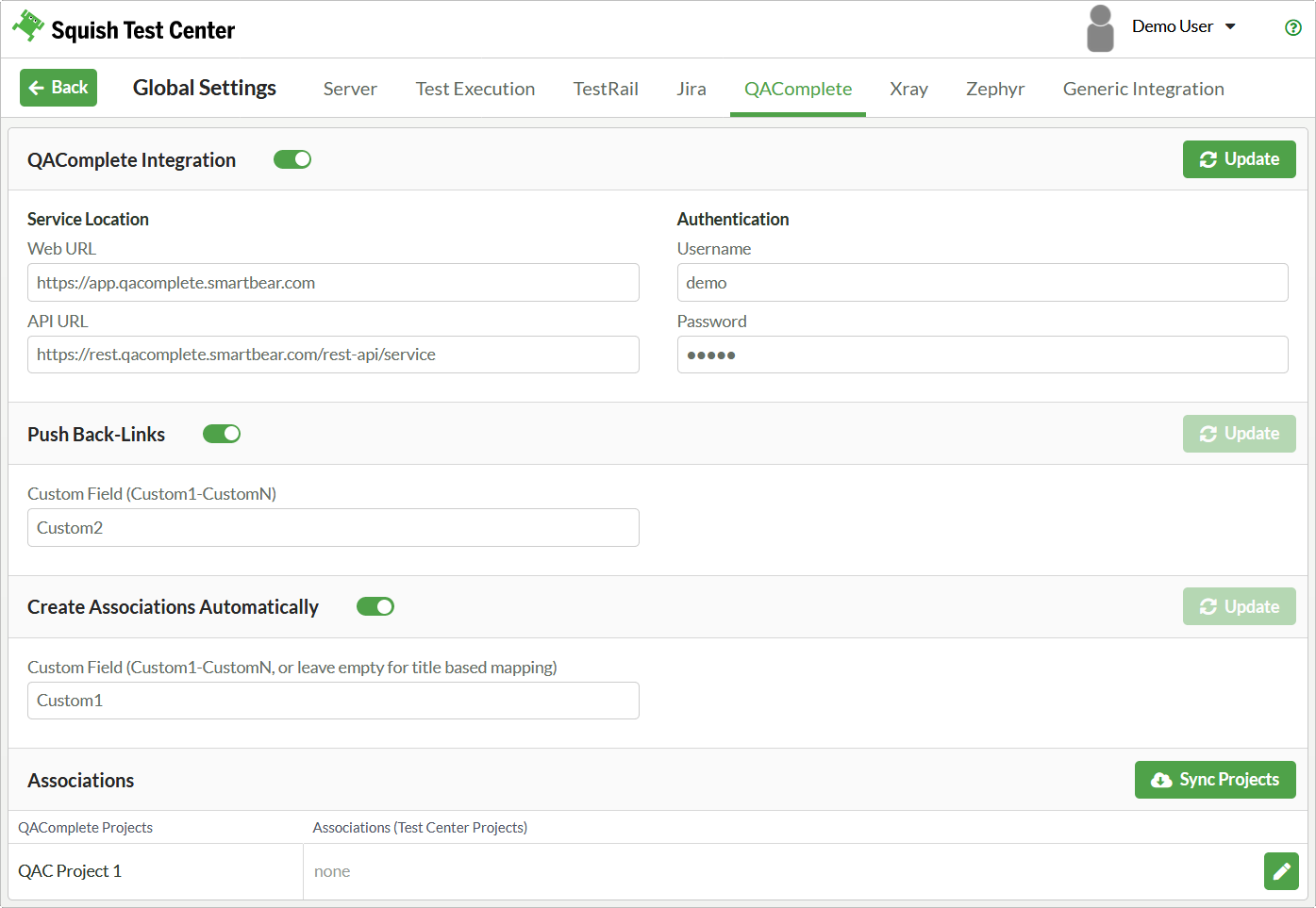 Click the Sync Projects button to fetch QAComplete projects and make them appear in the Associations list, where you can map each QAComplete project to its Test Center counterpart.