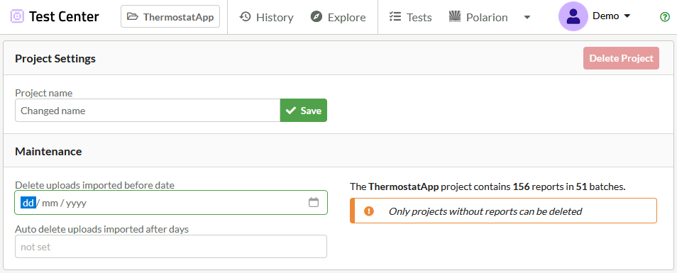 To delete a project you can use the Delete Project button. The project deletion will only be available if the project contains no more result data. That means the number of reports and batches displayed within the Maintenance section needs to be 0.