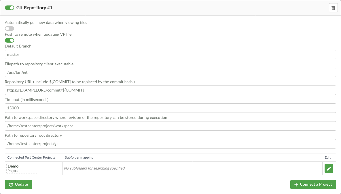 Fill in the required repository settings and click Submit. To change repository settings, click the Update button. Project mappings and subfolders are updated separately. Click Connect a Project and select the Test Center project that will use this repository. Click Connect to confirm the connection. You can link multiple projects to one repository this way.