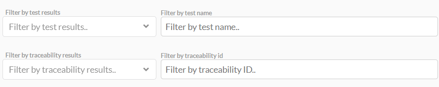Select Filter by Project and Filter by Suite to limit the traceability view to items from a specific external project or test suite. To look up traceability items by name or by id, select Filter by Text. Select Filter by Result to find all Requirements for which the associated tests have failed or been skipped in the currently selected Batch. Additionally, you can find all requirements and tests that don't have any associations yet.
