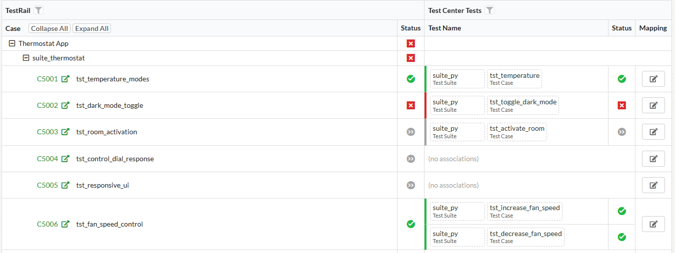And then to create or remove a mapping, either double-click the intersecting cell or press the Create Mapping button. After that, the matrix will update the cell with the corresponding test result.