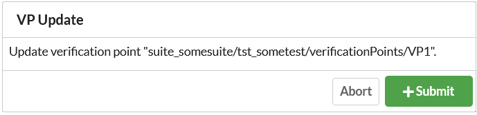 The updated verification point file is committed to the default branch specified in the Git repository settings or the head of the branch specified by the .git.branch label. If the verification point file was already updated by another user or at a previous point in time, the Submit button is disabled and an info message is displayed.
