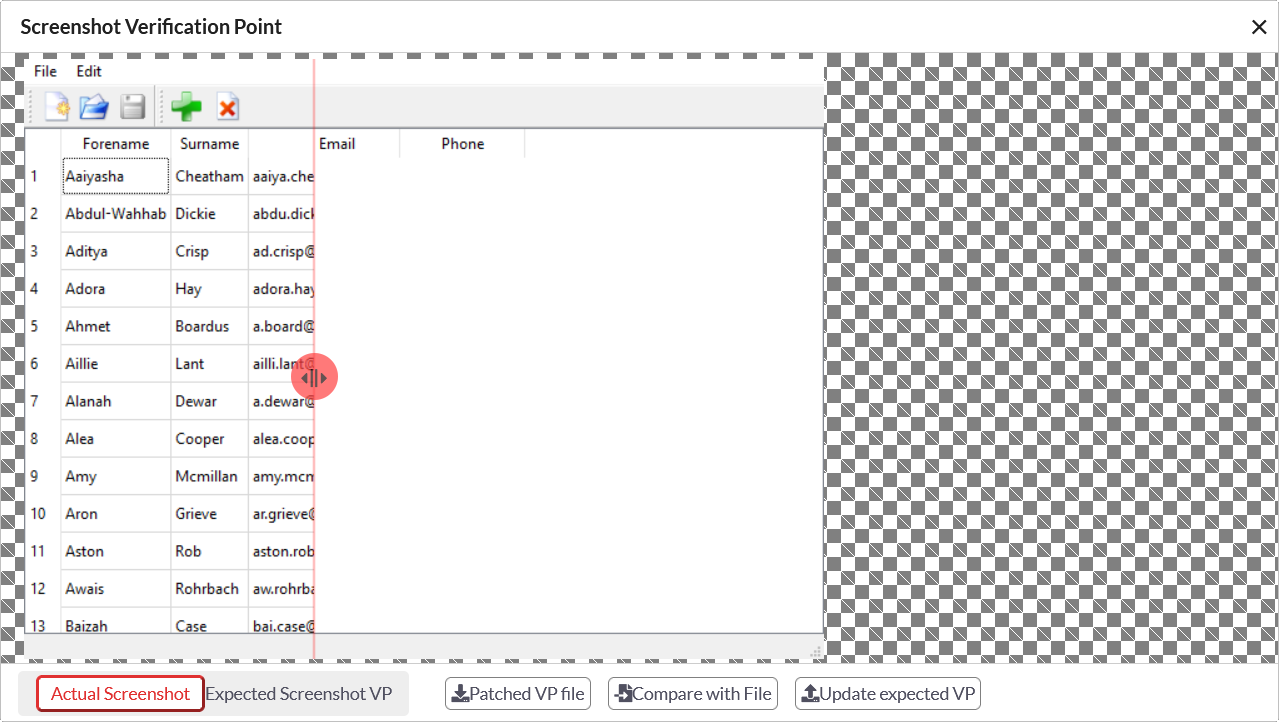 Select Actual Visual and Expected Visual VP to switch between the actual and expected images. An image slider can also help you spot the differences between them. Grab the red handle with the mouse to move the slider. If the verification point file cannot be located or no repository is set up, the dialog will show setup instructions instead of the expected images.