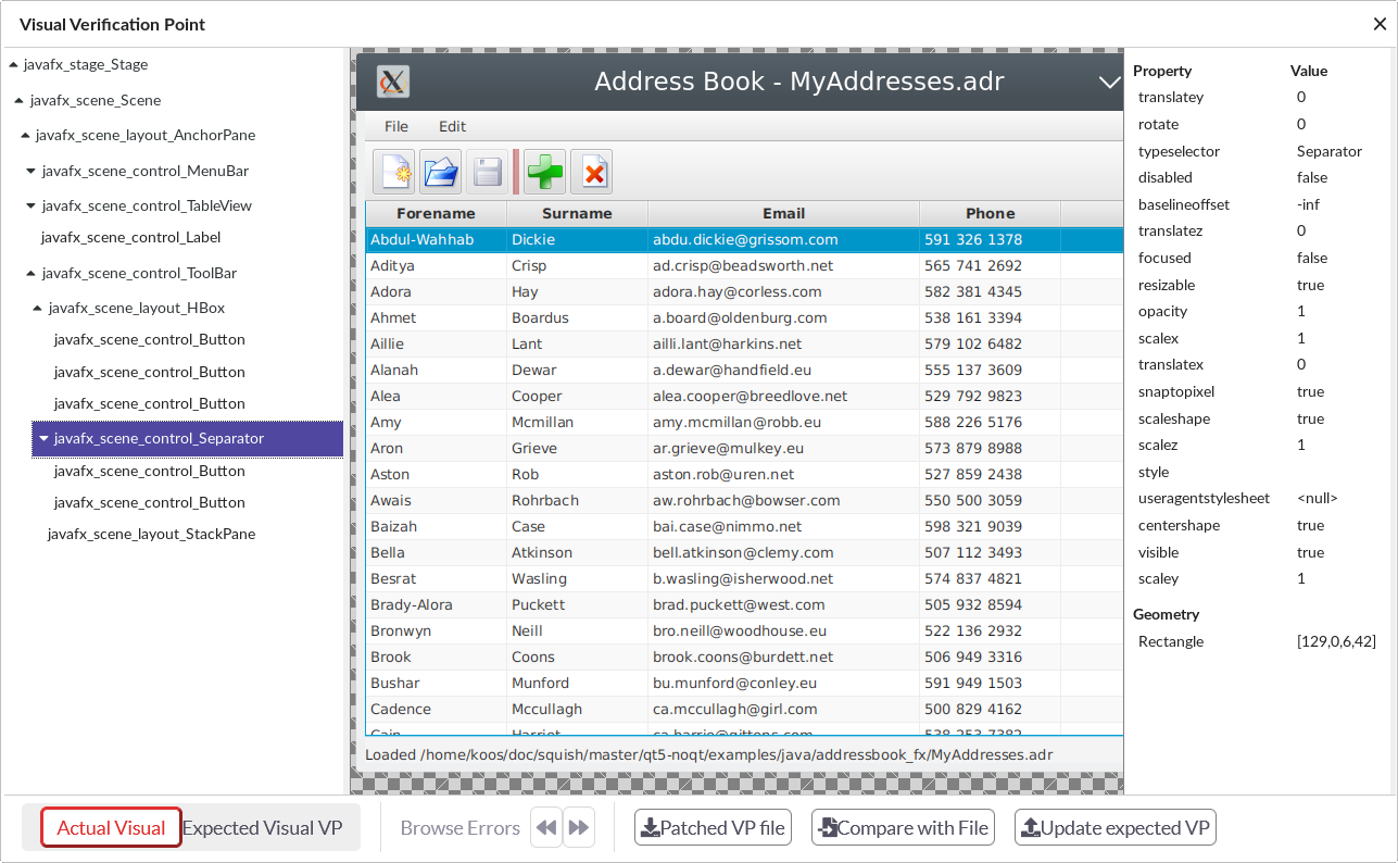 With a visual verification point (VVP) failure during a Squish test run, a dump of the application actual user interface (UI) is saved in the results. As mentioned, the camera icon represents the link to the failed VVP results. Right-click the result file to save it for later viewing with the Squish uibrowser or visualvpeditor utilities. To show this dump in Test Center, click the camera icon. This opens the Visual Verification Point dialog.